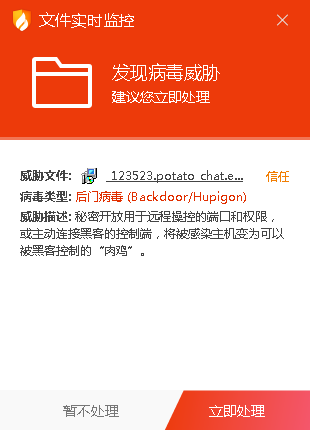 近日,火绒工程师发现一个仿冒potato chat软件(一款通讯工具)的官网正在传播灰鸽子远控软件,不排除灰鸽子遭恶意利用投放,诱导欺骗用户安装,达到控制用户电脑的目的。为避免更多用户遭遇安全风险,火绒紧急对该版本(6.8.0.0)灰鸽子软件进行拦截查杀,报毒类型为后门程序。