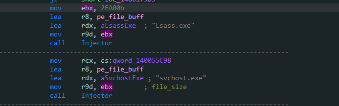 病毒驱动会将恶意代码注入到Lsass.exe和Svchost.exe两个系统进程中,伪装成系统进程来执行恶意程序,相关代码,如下图所示: