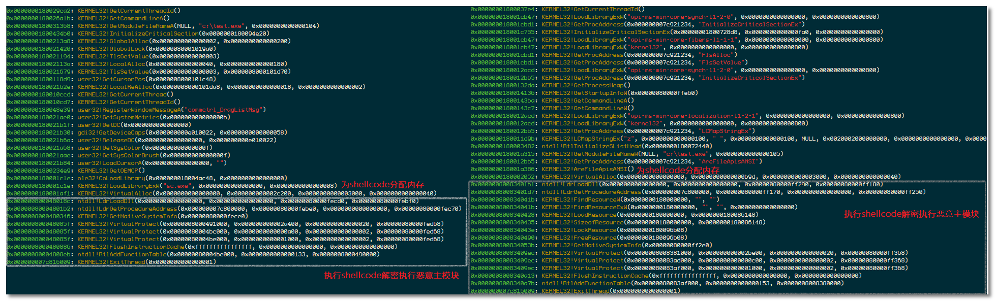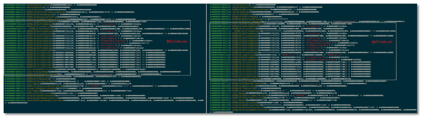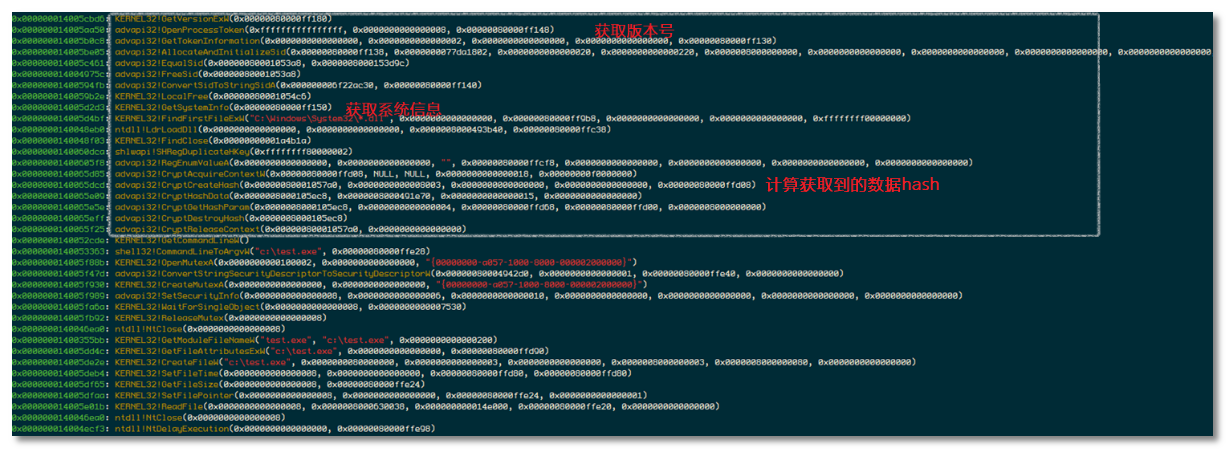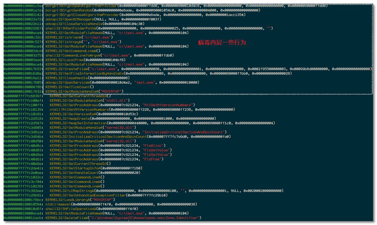 在64位Emotet中,已经开始大量使用控制流平坦化来影响安全人员分析,在火绒虚拟行为沙盒中,也可以看见一些内层的运行细节,如下图所示:
