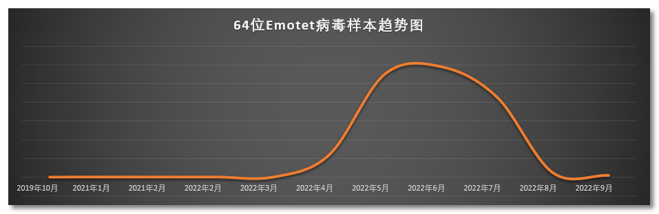 Emotet病毒主要通过鱼叉邮件方式进行传播,即针对特定用户、组织或企业,“定制化”地进行网络钓鱼攻击。当用户点击运行邮件附件后,病毒就会被激活,并在终端后台盗取各类隐私信息(浏览器记录、电子邮件信息、凭证信息)。此外,Emotet还会传播其他病毒家族,如:TrickBot银行木马和Ryuk勒索病毒。从2022年4月份开始64位变种大量增加, 11月初64位再次出现增长现象, 64位Emotet病毒样本趋势图,如下图所示: