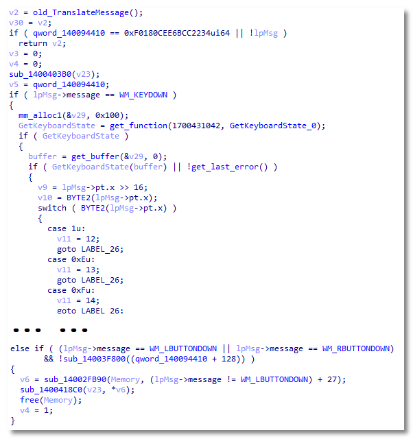 通过HOOK 进程的TranslateMessage函数来记录受害者键盘输入,相关代码,如下图所示: