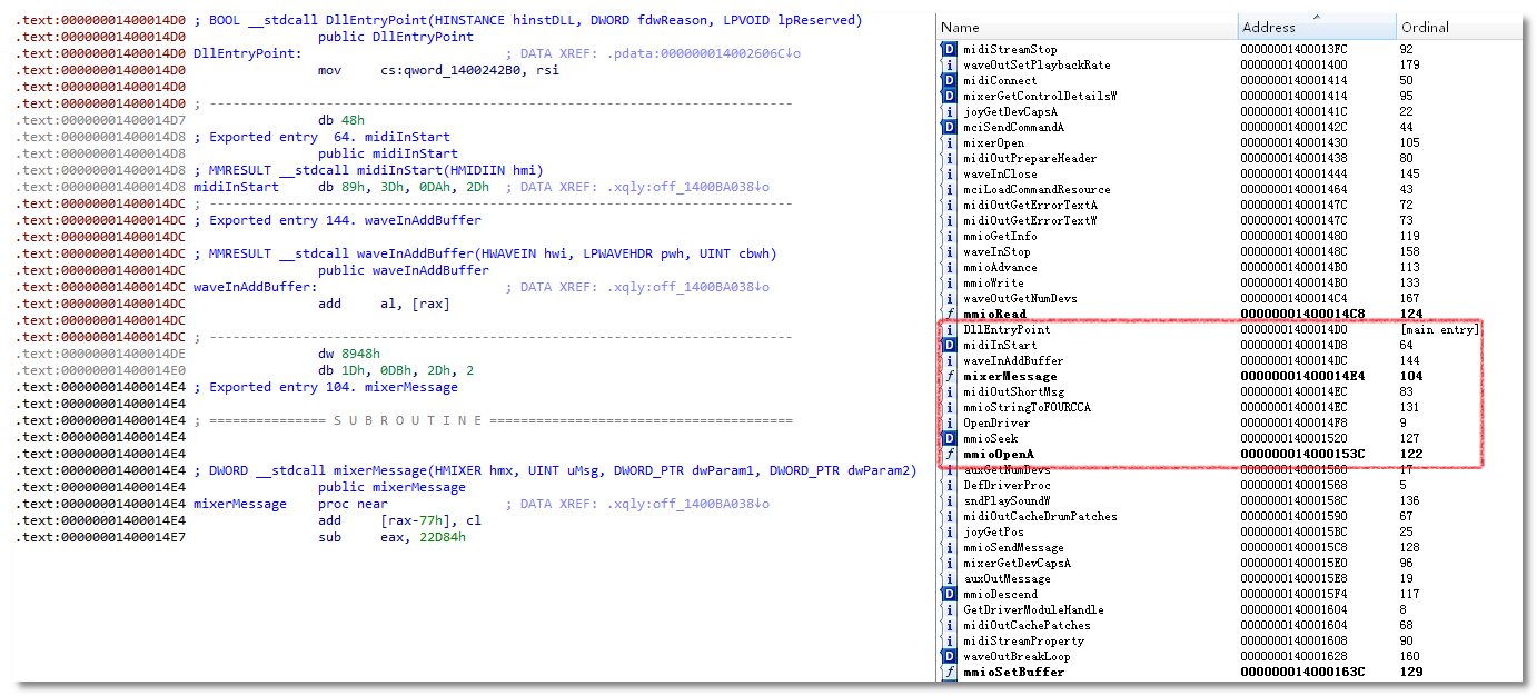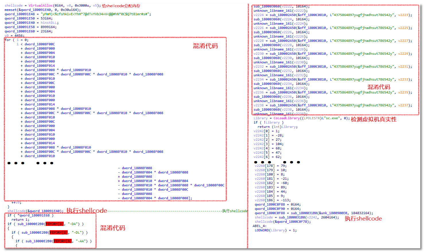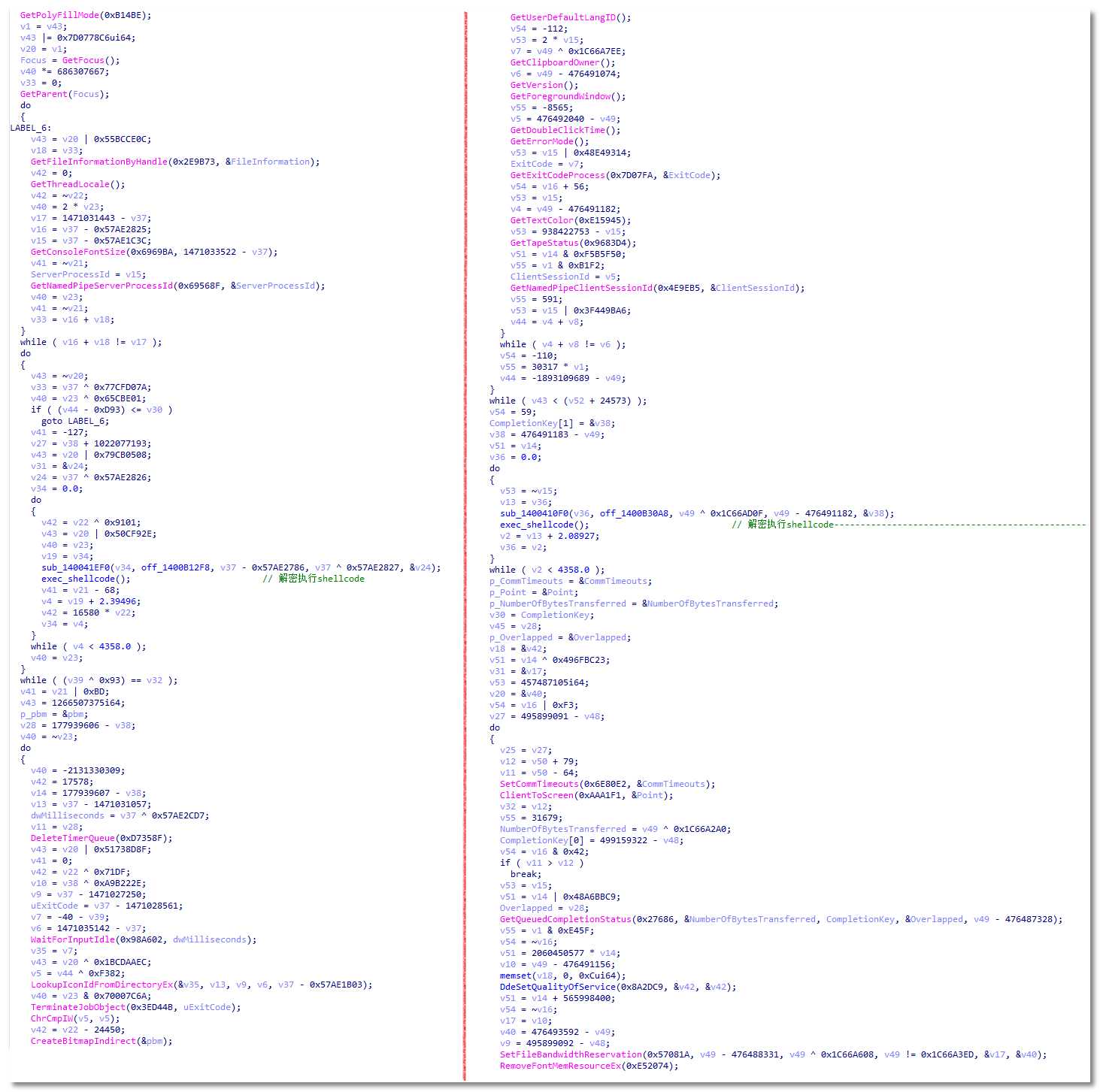 与Emotet相比Dridex的外层混淆器更加复杂,将关键代码隐藏在大量混淆代码和无意义循环中进行混淆 ,为了对抗安全人员分析还会将重要的函数分段导出为多个函数,导致IDA识别出错,给分析人员制造难度,如下图所示:
