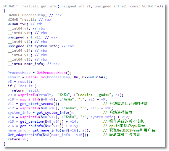 收集本机信息,并发送给C&C服务器,相关代码,如下图所示: