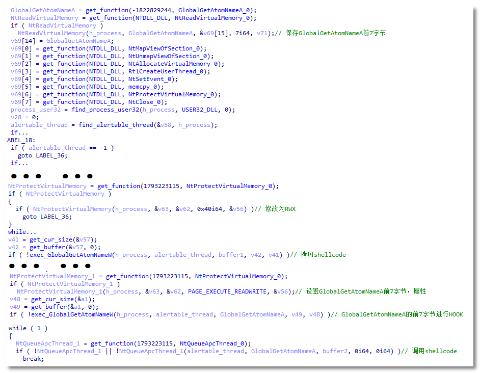 通过AtomBombing注入将恶意代码注入进其他进程中来躲避杀毒软件查杀,相关代码,如下图所示: