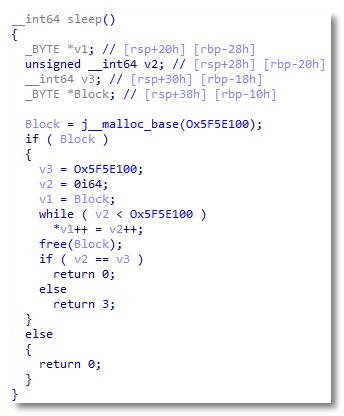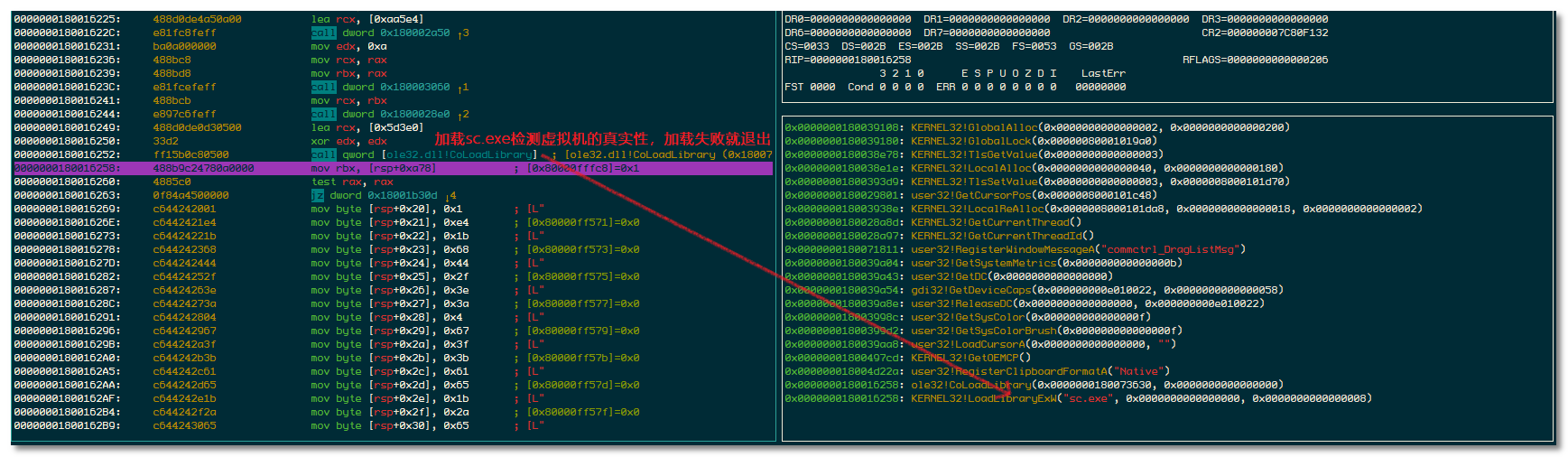 64位Emotet混淆器中使用了一些与虚拟行为沙盒对抗的技巧, 如:循环执行无意义代码,让虚拟行为沙盒超时;调用CoLoadLibrary函数动态加载一个系统的exe文件,来检测虚拟行为沙盒环境的真实性,以下进行一一举例: