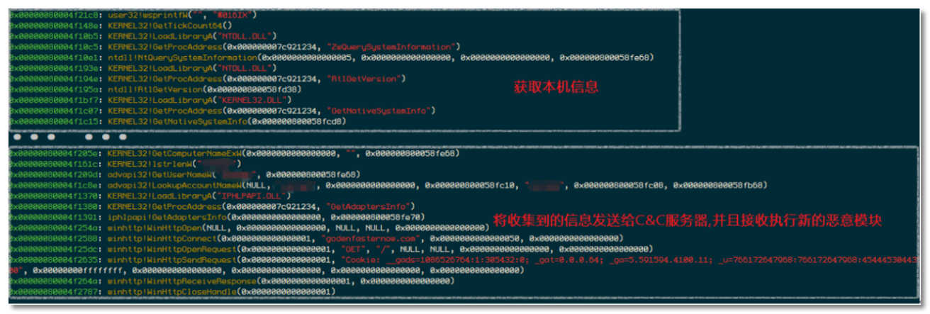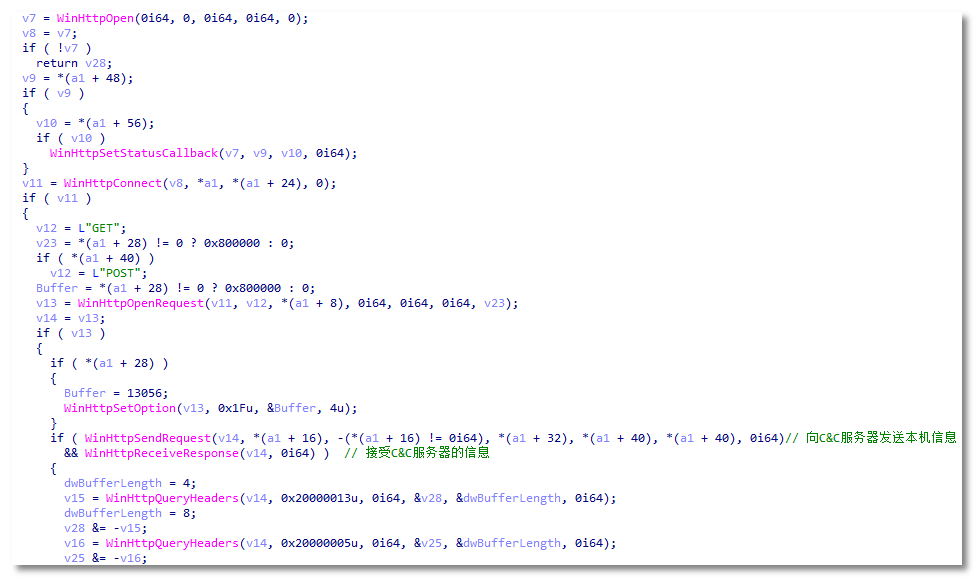 将收集到的信息发送给C&C服务器,并接收新的恶意模块,相关代码,如下图所示:
