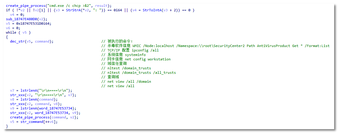 执行Shell命令来获取系统各种信息如:杀毒软件、网卡、域等信息,相关代码,如下图所示: