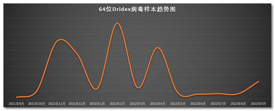 Dridex是一种臭名昭著的银行木马,出现于2011年左右,至今仍然非常活跃,主要通过收集键盘记录、屏幕截图、剪贴板内容等信息,窃取受害者的隐私信息。从2021年10月份开始Dridex大量出现64位变种,64位Dridex病毒样本趋势图,如下图所示: