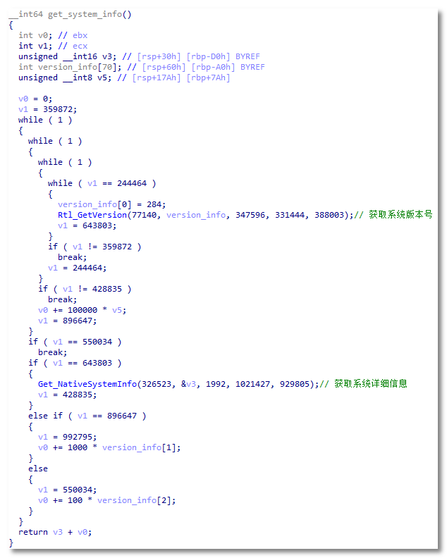 病毒启动后会收集各种系统信息(CPU、网卡、进程等信息)发送给C&C服务器,C&C服务器中会根据收集到的信息进行判断,如果检测到虚拟机或者调试器相关环境信息,则会将该IP地址拉黑不再下发后续模块,收集系统信息相关代码,如下图所示: