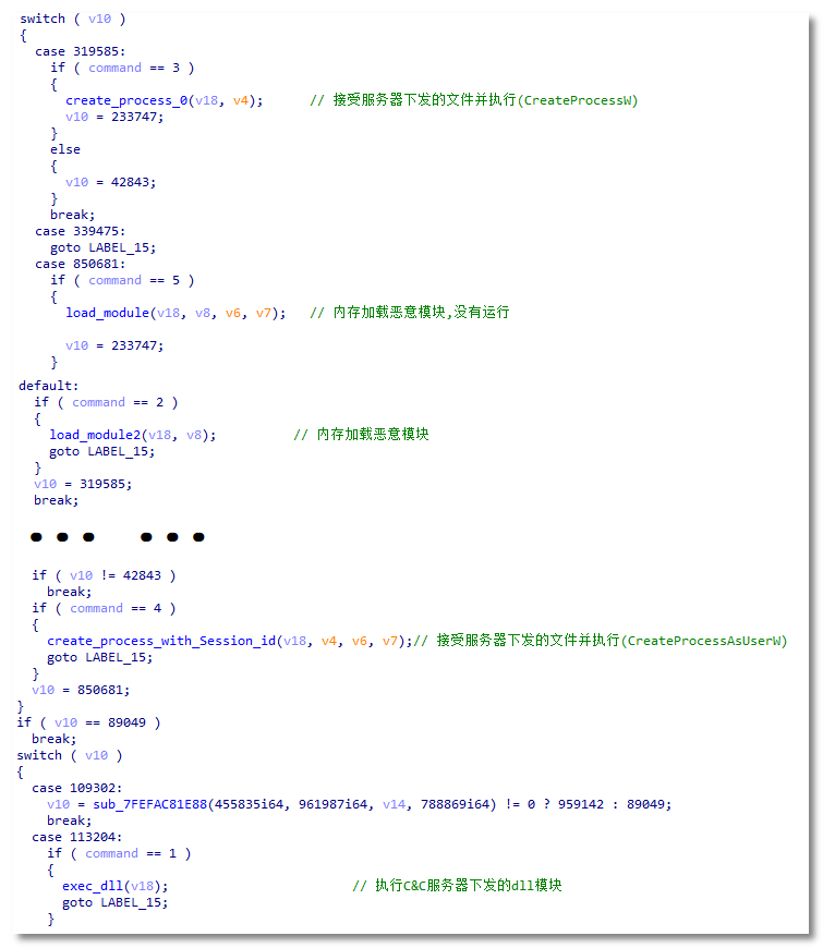 Emotet主模块接收C&C服务器下发的指令,根据指令执行不同的恶意功能,如:执行任意恶意模块(窃取模块、横向传播模块等恶意模块)。执行C&C服务器下发的指令,相关代码,如下所示: