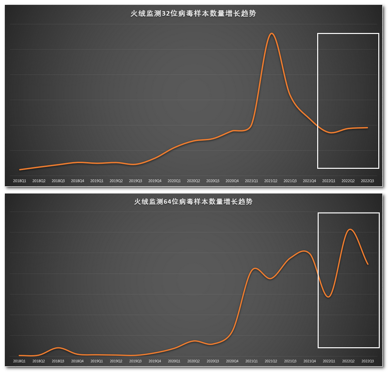 根据长期数据统计显示,依赖“病毒混淆器”不断变形的病毒家族样本在2021年进入高速增长期,虽然出现阶段性下降,但总体依然处于上升趋势。与此同时,Win64病毒样本数量也在大幅上涨,2021年全年相较于2020年,Win64病毒样本数量已增长了5倍,且今年单季度样本增速再创历史新高。如下图所示: