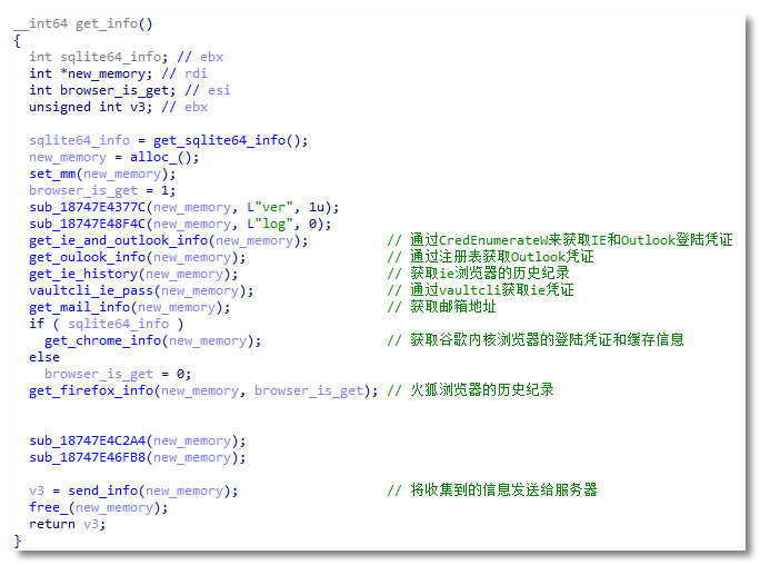 恶意模块中,会收集受害者各种隐私信息如:各种浏览器的登录凭证、Cookie、历史记录;电子邮件的登录凭证等信息,并执行C&C服务器下发的任意命令,以下进行举例说明。
