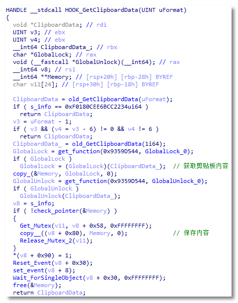 通过HOOK进程的GetClipboardData函数来获取剪贴板内容,相关代码,如下图所示: