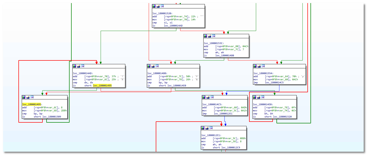 IcedID外层混淆器难度较低,只是添加了一些无意义循环,并将代码块拆分成多个块,每个代码块之间利用跳转连接,IDA代码流程图,如下所示: